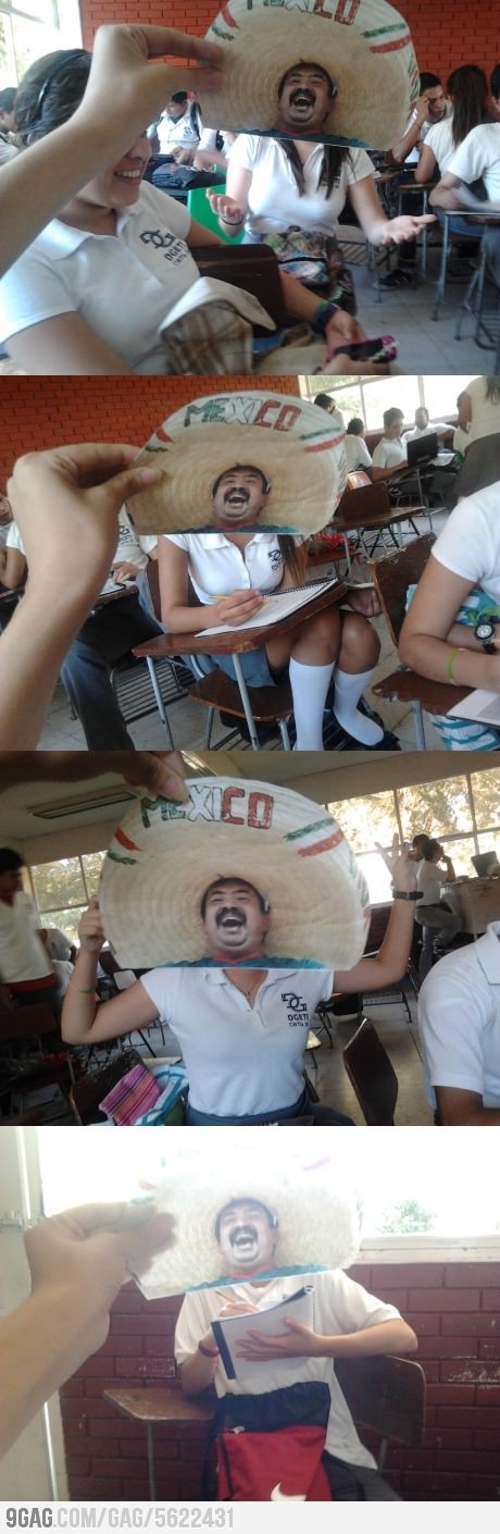 사진 속에는 외국의 한 고등학교로 추정되는 학급 내에서 여고생들이 멕시코 전통모자를 쓰고 함박웃음을 짓고 있는 아저씨의 그림으로 장난을 치는 모습이 담겨 있다.