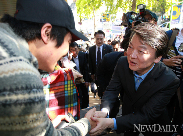 무소속 안철수 대선후보가 23일 인천시 남구 인하대학교 후문 먹자골목에서 시민들과 인사를 나누고 있다.