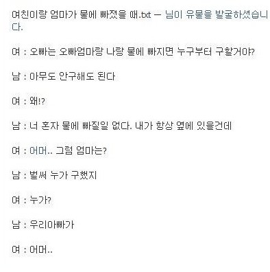 이 게시물속에 담긴 난제는 남성이라면 누구나 고민했거나 할 법한 문제다. 바로 ‘여자친구랑 엄마가 물에 빠졌을 때 누구를 먼저 구하는가’이다.