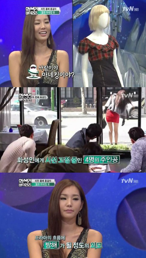 엘프 마네킹녀는 가슴이 V라인으로 깊게 파인 미니원피스를 입고 나와 남성 MC들이 눈둘곳 없게 만들었다.