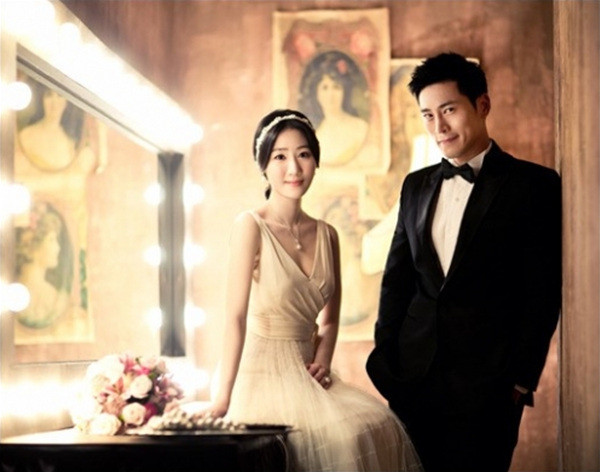 공개된 사진 속 김재우는 턱시도를 입고 늠름한 모습을 보이고 있으며, 예비신부는 가슴라인이 깊게 파인 민소배 드레스를 입고 흰색 머리띠를 착용해 아름다운 여신 분위기를 연출하고 있다.