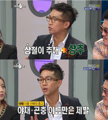 그는 이어 "오늘 녹화 오기 전에 인터넷에 '상추'라는 키워드가 올라와 있었다. 그래서 눌러 보니까 '상추 값 90% 하락' 이더라"며 "비슷한 고충을 겪는 이름들이 많다. 상추, 거미, 양파, 양배추... 이제는 후배들에게 절대 야채, 곤충 이름을 쓰지 말라고 충고한다"고 털어놔 웃음을 자아냈다.
