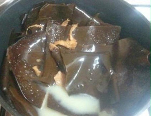 사진 속에는 커다란 미역이 가득 들어있는 반면 국물은 우유색을 띄고 있어 눈길을 끈다.