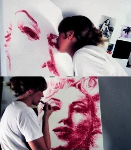 해당 사진은 립스틱을 바른 입술로 흰 종이에 그림을 그리는 한 여성을 찍은 것이다. 특히 이 여성은 입술과 립스틱만을 사용하면서도 붓으로 그린 듯 정교하게 마릴린먼로 그림을 완성했다.
