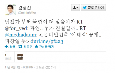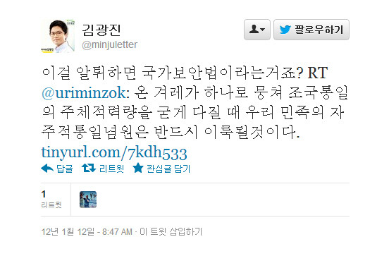 김광진 의원은 지난 1월 12일 트위터를 통해 북한이 운영하는 SNS 종북 사이트 '우리민족끼리'의 멘션을 리트윗하면서 이렇게 말한다.국가보안법을 조롱하는 듯한 말이다.