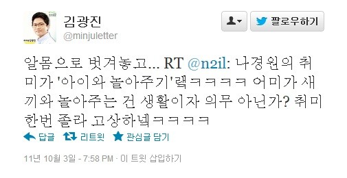 김광진 의원이 지난 1월 22일 자신의 트위터를 통해 리트윗한 내용이다.