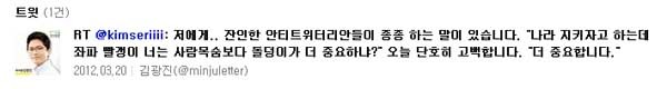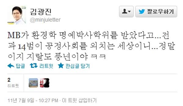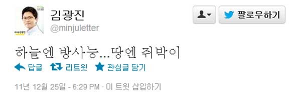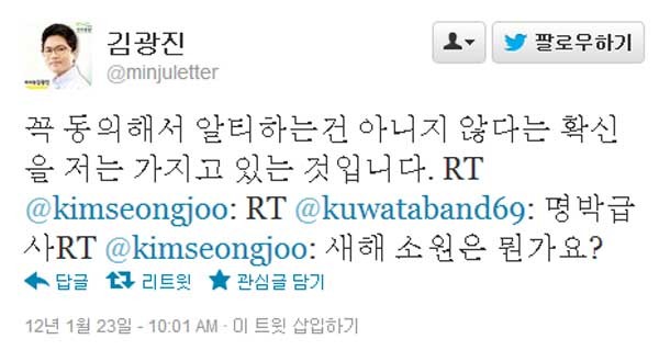 26일 "새해소원은 명박급사"라는 연초의 '막말트윗'으로 대선후보캠프에서 맡은 역할을 내놓은 김광진 민통당 의원의 트위터 발언들이 가관 수준인 것으로 드러났다.