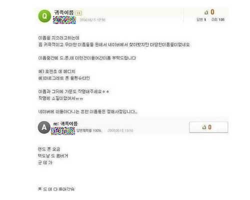 내용은 한 이용자가 "귀족적인 이름을 지어달라. 네이버에서 보는 흔한 이름 말고"라고 질문을 올렸다.
