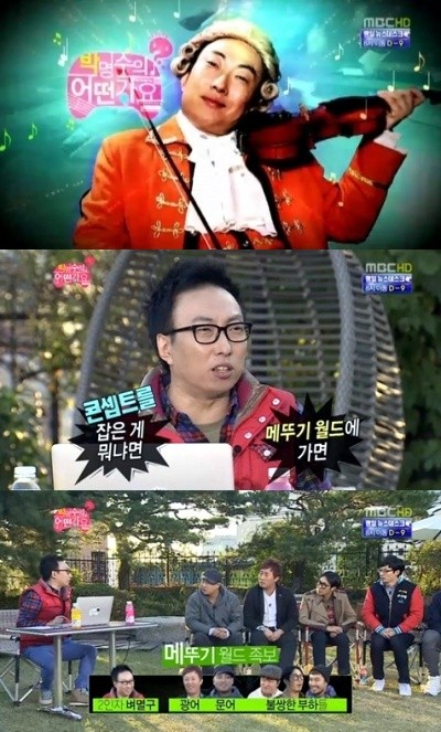 박명수의 자작곡 '메뚜기월드'가 공개되자마자 표절시비(?)에 휩싸였다.27일 오후 방송된 MBC 인기 예능프로그램 '무한도전'에는 2012년 연말 특집 콘서트에 사용할 노래를 준비하는 이야기가 그려지며 최근 작곡 공부를 하고 있는 '박명수의 어떤가요'가 공개됐다.