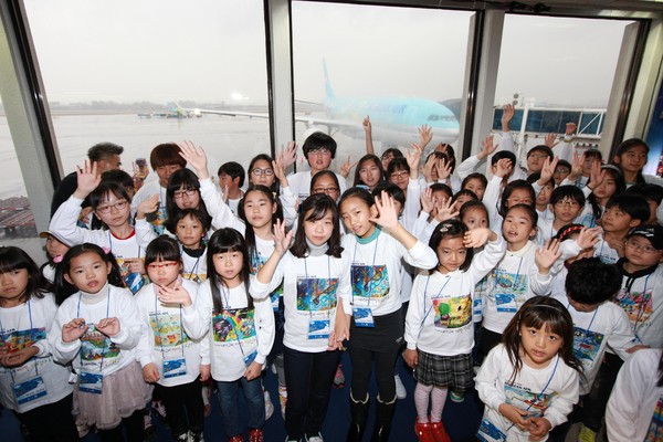 시상식 후 수상 어린이와 가족들은 래핑 항공기에 탑승해 래핑작업이 이뤄진 대한항공 부산 테크센터를 견학했다.
