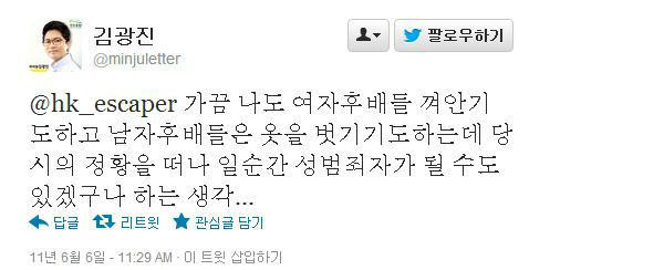 남녀 구분없이 후배들과 스킨십 과정에서 성범죄로 이어질 수 있는 '성욕'을 느꼈음을 가감없이 트위터에 남긴 셈이다. 김 의원의 트위터에는 '채찍', '수갑', '노예' 등 변태적인 성관계를 연상시키는 단어를 손쉽게 찾아볼 수 있다. 왜곡된 성(性) 인식에 대한 부끄러움 보다는 되레 "사진을 찍어 올리겠다"며 자랑을 쏟아내기도 했다.
