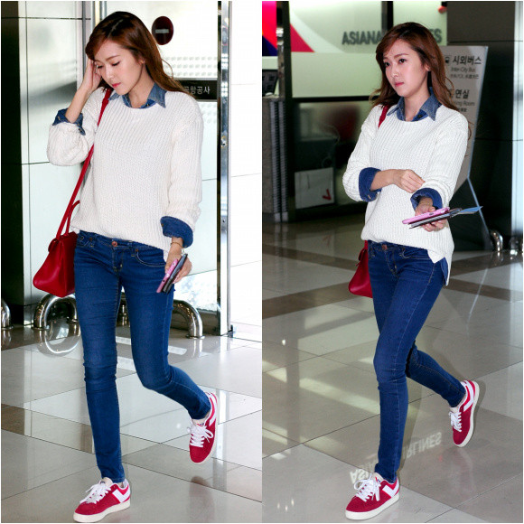 이날 제시카는 니트 안에 데님 소재의 셔츠를 레이링해 전체적으로 통일감을 주었고, 레드 백과 레드 포니 운동화로 원 컬러 포인트 스타일을 완성하였다. 빛이 나는 깨끗한 피부와 타고난 몸매 때문인지 낮은 운동화를 신었음에도 그녀의 패션은 반짝반짝 빛이 났다는 후문이다.