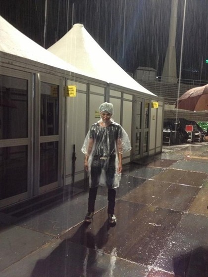 공개된 사진 속 지드래곤은 투명한 우비를 입은 채 비를 맞고 있다.