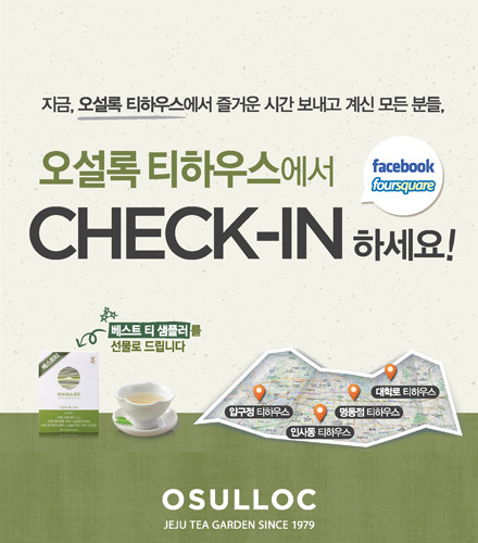 위치기반 소셜네트워크 서비스인 ‘체크인’은 해당 위치를 방문한 사용자가 그 장소의 주소 좌표, 방문기록을 남기는 기능이다. 오설록 티하우스를 방문해 매장 사진을 촬영하고 페이스북이나 포스퀘어에서 체크인을 하면 된다.
