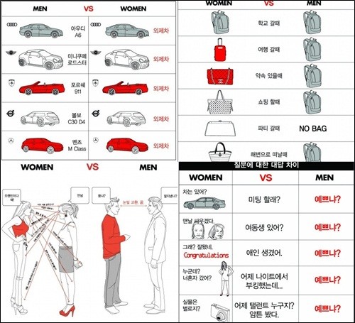 여자는 상황에 따라 각기 다른 느낌의 가방을 선택하지만 남자들은 항상 백팩만을 멘다. 반면 남자들은 모든 종류의 외제차에 관심을 갖지만 여자들 눈에는 그냥 '외제차'에 불과하다.