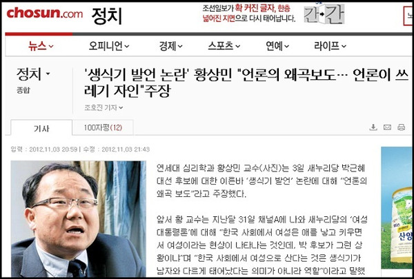 10월 31일 <채널A>(동아일보 종편)에 나와 새누리당의 ‘여성대통령론’에 대해 “한국 사회에서 여성은 애를 낳고 키우면서 여성이라는 현상이 나타나는 것인데, 박 후보가 그런 상황이냐. 그거는 생식기의 문제지 여성으로서의 역할을 한 거(는 아니지 않으냐)”라고 말해 설화를 일으킨 연세대 심리학과 황상민 교수는 3일 “언론의 왜곡 보도”라고 주장했다고 <조선닷컴>이 전했다.