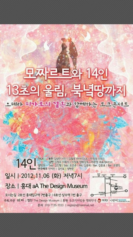 6일 오후 7시, 홍대앞 카페 'aA The Design Museum'에서 열리는 토크 콘서트의 이름이다. 남북 기독 문화예술인들이 준비했다. 모차르트의 오페라 ‘피가로의 결혼’과 함께한다.