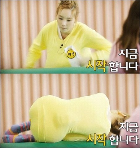 공개된 사진 속에서 태연은 한 예능 프로그램에 출연해 노란색 체육복을 입고 몸을 굴려 미션을 수행하고 있는 장면이 담겨져있다.