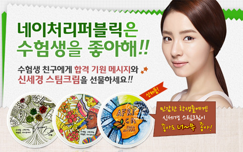 오는 11일까지 공식 페이스북에서 수험생 응원 메시지 남기기 이벤트를 진행한다. 페이스북에 ‘좋아요’ 버튼을 클릭한 뒤 수능을 보는 친구, 동생 등 지인에게 보내는 응원 메시지와 선물을 전달하고 싶은 주소를 기입하면 된다. 추첨을 통해 ‘신세경 스팀크림’(150명)과 온라인 쇼핑몰에서 사용할 수 있는 1만원 기프티콘(50명), CGV 2인 영화예매권(50명)을 증정한다.