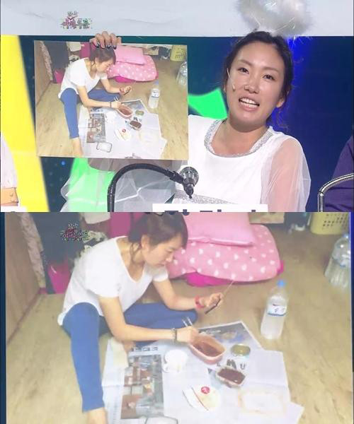 이어 정경미는 "후배 오나미 때문에 밥상 대신 신문지, TV 대신 DMB, 침대 대신 방바닥에서 생활하고 있다"며 고충을 토로해 웃음을 자아냈다.