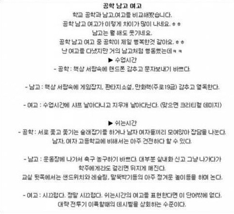 게시물을 접한 네티즌들은 "공감된다", "여고가 시끄럽긴 하지" ,"남고 진짜? 정말?", "난 쉬는 시간에 잠만 잤는데…난 어느 고등학교?", "그래도 공학이 최고지" 등 다양한 반응을 보였다.
