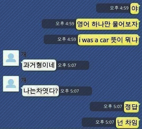 공개된 게시물은 한 남녀의 메신저 대화 내용을 캡처한 것으로 먼저 한 사람이 "영어 하나만 물어보자 'I was car'뜻이 뭐냐"라고 묻는다.