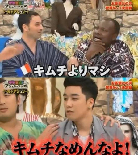 빅뱅의 멤버 승리가 김치비하 발언을 한 외국인에게 경고성 발언을 해 눈길을 끌고있다.승리는 지난 달 10월 2일 방송된 일본 나고야 TV '자키로바'라는 방송에 출연했다.이날 방송은 일본에 거주하는 다양한 국적의 외국인들이 등장해 일본의 음식 오챠즈케(밥에 차를 부어 먹는 음식)와 어울리는 자국의 전통음식을 소개하는 시간을 가졌다.