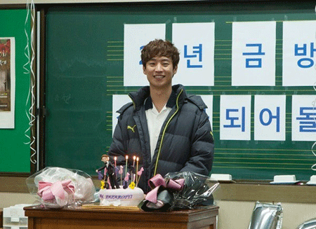 공개된 사진 속 이제훈은 교실로 보이는 촬영현장에서 케이크와 꽃을 앞에두고 두꺼운 패딩을 입은채 환하게 웃고있다. 특히 이제훈 뒤에 칠판에는 "2년 금방 갈 것" 이라는 내용의 문구가 적혀있어 웃음을 자아낸다.