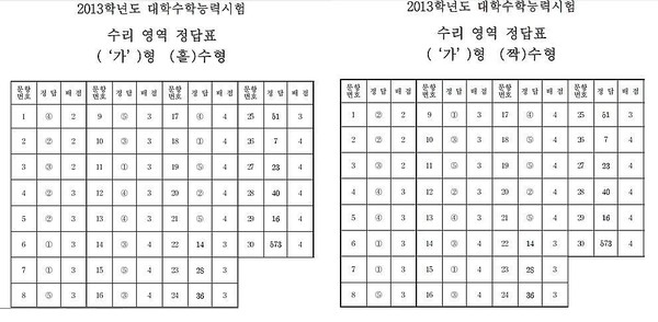 8일 2013학년도 대학수학능력시험이 치러지고 있는 가운데 한국교육과정평가원 홈페이지에 수리영역 '가'형 홀-짝수형 정답지가 공개됐다.