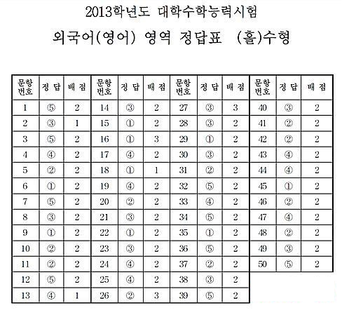 8일 2013학년도 대학수학능력시험이 치러지고 있는 가운데 한국교육과정평가원 홈페이지에 외국어영역 '홀수형' 정답지가 공개됐다.