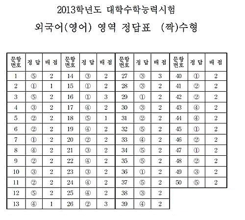 8일 2013학년도 대학수학능력시험이 치러지고 있는 가운데 한국교육과정평가원 홈페이지에 외국어영역 '짝수형' 정답지가 공개됐다.
