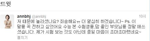 MBC 뉴스데스크 진행 도중 방송 사고를 낸 배현진 아나운서가 자신의 트위터를 통해 사과의 말을 남겼다."저 때문에 놀라셨나요? 죄송해요ㅠ 더 열심히 하겠습니다~ Ps. 이 말을 꼭 전하고 싶었어요 수능 본 수험생들,맘 졸인 부모님들 정말 애쓰셨습니다. 제가 시험 보는 것도 아닌데 종일 마음이 조마조마했네요~"