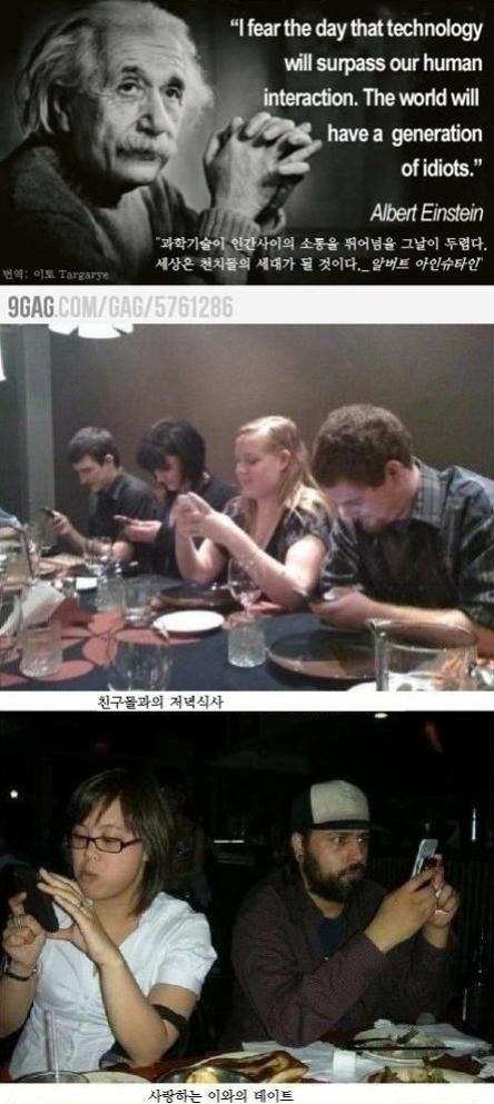 글쓴이는 아인슈타인의 예언을 뒷받침하는 몇 장의 사진도 함께 올렸다. 친구들과 커피 마시고 식사를 할 때, 애인과 데이트를 할 때도 사람들은 휴대폰만 쳐다볼 뿐 상대에게 관심을 갖지 않는다.