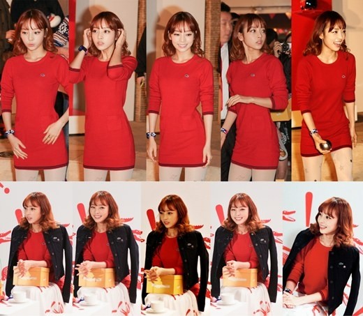 사진 속 구하라는 해당 브랜드의 레드 컬러의 원피스를 입고 귀여운 매력과 동시에 섹시미도 물씬 풍기고 있다.