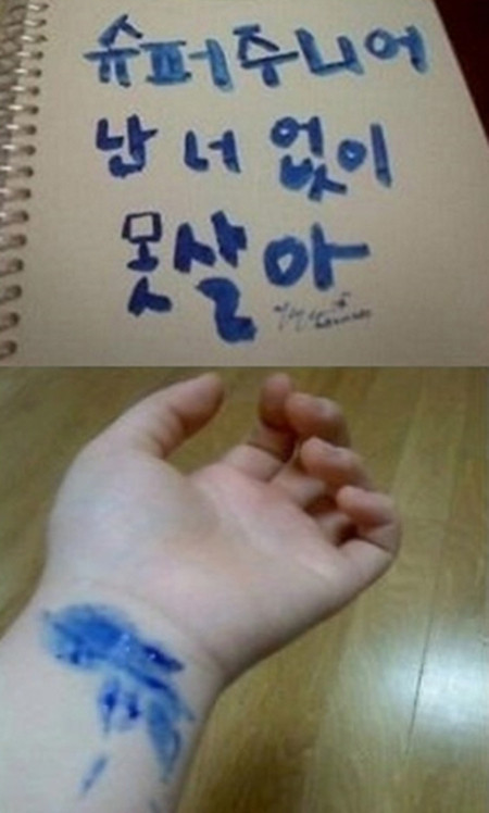 공개된 사진에는 슈퍼주니어 팬클럽 ‘엘프’의 회원이 파란색 물감으로 ‘슈퍼주니어 난 너 없이 못 살아’라고 쓴 글이 담겨 있다.