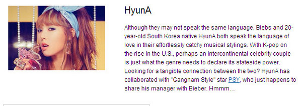 이어 “현아는 싸이의 ‘강남스타일’에 참여하기도 했다. 이후 싸이가 비버의 매니저 스쿠터 브라운과 계약했다”고 덧붙였다.