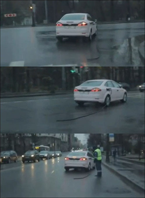 사진 속 장면은 자세히 보면 주유 호스를 빼지 않고 달리는 자가용 모습이 담겨있어 눈길을 끈다. 차 주인이 셀프 주유소에서 주유를 한 뒤 호스를 빼는 것을 잊고 출발한 것으로 보인다.