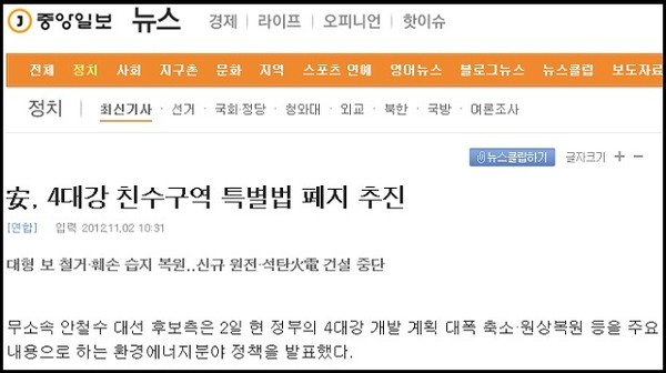 안철수 후보가 ‘집권하면 4대강 보를 파괴하겠다'고 공언하지만, 정작 우방국가들은 ‘4대강 정비사업’을 배우려는 현실이다. 마치 아프리카 국가들이 새마을운동을 배우듯이, 우방국들이 4대강 정비사업도 배우고 있다.