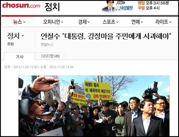 정부의 주민설득과 지도자의 현장방문 등 미흡한 점이 있었을지 모른다. 그러나 가장 큰 갈등의 원인은 ‘미군의 기지 사용을 막아야 한다’는 반미운동권의 이데올로기였다. 安후보는 사태의 본질을 모른 채 또는 모르는 척 하면서 정부만 난도질 쳤다. 자신을 지지해 온 좌경깽판세력의 구미에 맞추는 비겁한 말이자 지도자로서 국민과 국가의 총합적 이익을 무시하는 말이다.