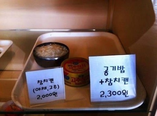 사진에는 고추참치캔 하나와 공기밥 하나가 찍혀있다. 사진 속에는 참치캔(야채, 고추)은 2000원, 공기밥+참치캔은 2300원에 판매한다고 적혀있다.