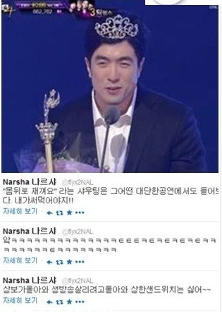 박상보는 지난 16일 경희대학교 평화의 전당에서 열린 '슈퍼스타K4' 슈퍼시상식에서 'Crazy voice'를 수상했다. 이에 나르샤는 17일 오전 자신의 트위터에 "Crazy Vocie 상. 복통령! 히야"라는 글과 함께 복통령 박상보의 사진을 게재했다.