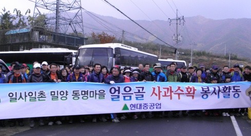 현대중공업은 지난 2005년부터 경남 밀양의 동명마을과 자매결연을 맺고 매년 농작물 수확은 물론 명절선물 전달, 경로잔치 개최 등을 통해 주민들과 친분을 나누고 있다.