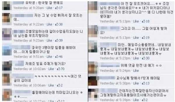 이들이 올린 글을 보면 설마 이럴까 싶지만 실제 최근 대학에서 일어나는 일이라고 한다. 한국말을 못한다는 핑계를 대는 중국인 유학생, 수업에 빠져 내용을 모른다는 사람, '내일 하겠다'는 약속만 계속 하는 사람, 톱질해야 하는데 치마 입고 오는 사람, 심지어는 발표 주제조차 모르는 사람도 있다고.