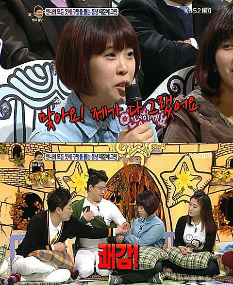 지난 19일 방송된 KBS 2TV '대국민 토크쇼 안녕하세요'에서는 “여동생이 심심하면 손으로 내 옷에 구멍을 내서 남아나는 옷이 없다”며 동생 때문에 일상생활에서 늘 망신을 당한다는 고민사연이 공개됐다.