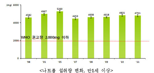 이에 보건복지부 관계자는 “우리나라 나트륨 섭취량이 여전히 높기는 하나 전년에 비해 다소 감소한 것은 고무적”이라며 “앞으로도 나트륨 줄이기에 동참하는 건강음식점 지정을 확대하고, 외식업중앙회 등을 통해 싱겁게 조리하는 문화가 확산되도록 하겠다”고 밝혔다.