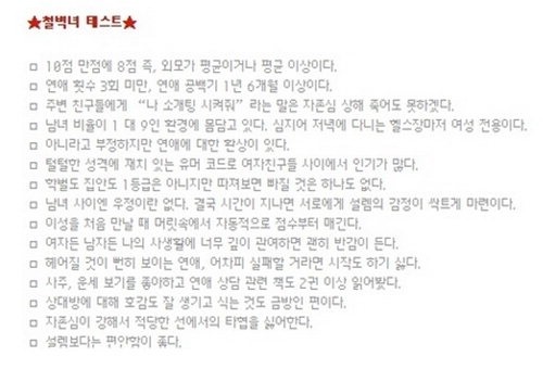 철벽녀 테스트에 따르면, 철벽녀는 평균 이상의 외모에 여성들 사이에서 인기가 많지만 연애 횟수는 3회이하, 연애 공백기가 1년 6개월 이상인 사람이다. 제시된 항목 중 8개 이상이 자신에게 해당한다면 철벽녀다.