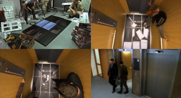 이 동영상은 엘리베이터 바닥에 설치된 LG IPS(In-Plane Switching) 모니터(모델명 IPS277L) 9개를 통해 바닥이 무너지는 듯 한 영상과 음향으로 탑승자들을 놀라게 한다.