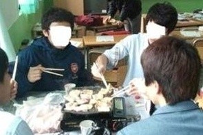 사진 속에는 4명의 남학생들이 교실에서 버너 위에 고기를 구워먹고 있다.