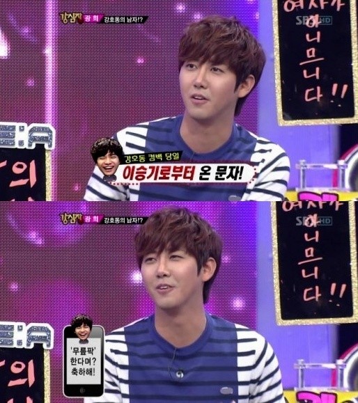 이날 MC 신동엽은 광희에게 “요즘 광희가 강호동이 컴백하면서 ‘강호동의 남자’로 기사가 많이 났다”고 말하자 광희는 “최근 강호동과 함께 촬영했다. 녹화날 승기 형한테 문자가 왔다. 이승기 형한테 진짜로”라고 흥분된 목소리로 밝혔다.