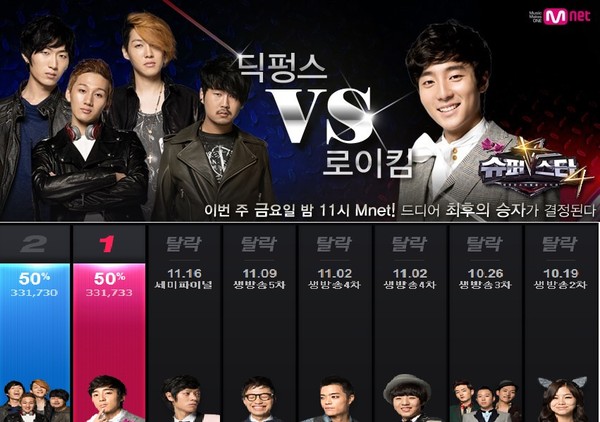 '슈퍼스타K4' 최종 결승전을 앞두고 딕펑스와 로이킴의 사전투표 지지율이 공개됐다.